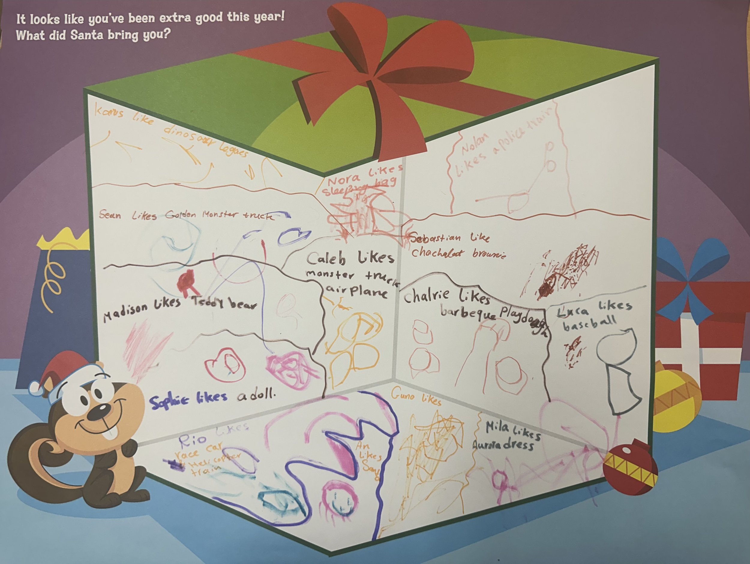 We played both outside in the yard and inside the classroom. In the gym, we played fun games such as “Ho, Ho, Ho Santa” and asked the children to find pictures of Christmas symbols that were set up on the gym walls.
