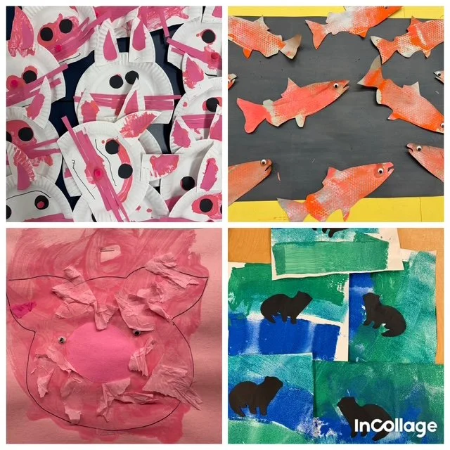 Then our first child introduced us to the Axoltle, an amazing little creature, the unicorn of salamanders. Most of us hadn’t heard of this one before, but we had a lovely bejewelled poster to refer to! Next we saw pictures of our other friend actually feeding a Giraffe (it had a black tongue!) With the Frog, we got back to amphibians and made cute paper plate frog faces, then went miles away to see Penguins: it turns out, most don’t live on the ice. We made monkeys with long tails, and hung them in the classroom from our ceiling. One friend has seen real Camels, and shared their favourite book with us and another told us all about Koalas, another animal whose babies are called joeys. We learned about Snakes and made a coiling paper one, then heard all about Sheep, and made sheep masks and marched and sang songs. Next we went to Africa and learned about Lions and used forks to paint their manes. We learned that Elephants are from Africa and South Asia and made masks for ourselves, and played at being elephants. One friend told us about Gerbils, and we used felt and sawdust to decorate our paintings of them. Another friend told us all about Cats, both wild and domestic, and explained why our pet cats act the way they do. Then we moved on to learn about Salmon; so interesting and close to home, here in North Vancouver. For art we made very realistic looking silver and red scaly fish. Next was the Hippo, back in Africa, and we cut, glued and painted our art of them.