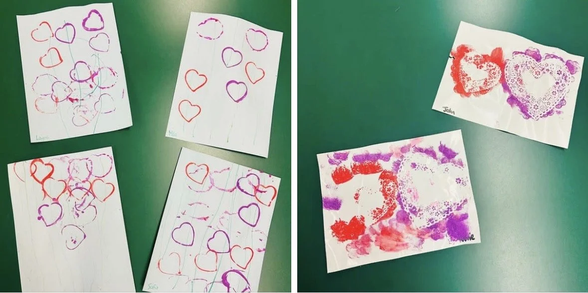 Our Valentine-themed art activities included making hearts using different colours and materials, including shaving cream, which was a favourite! The children also created collages using cut newspapers and practiced more challenging cutting skills with teacher supervision.