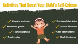 Focus on the process, such as saying, "You worked hard on that tower." rather than just "Good job." Give preschoolers small, manageable chores or choices to make them feel capable, such as picking out clothes or helping to set the table. Listen actively by taking their thoughts and feelings seriously and showing them that their opinions matter, which builds a sense of self-worth. Every child is unique, and self-esteem may come more easily to some children than others. Self-esteem helps children do better at home, at school, and with their friends. Celebrate your child's unique talents and avoid making comparisons to peers or siblings.